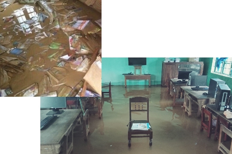 Sách vở học sinh Trường TH & THCS Trung Sơn bị nhấn chìm trong nước và bùn (hình trên, bên trái). Phòng máy tính Trường TH & THCS Trung Sơn bị ngập 1m nay nước đã rút (hình ngang, bên dưới)